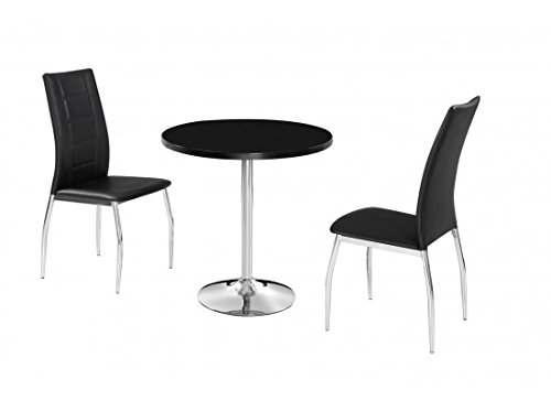 PRODUCT DESCRIPTIONS:Set comes with Table and 2 ChairsHi-gloss, bistro style tables with polished chrome pedestal with coordinating faux leather chairs with geometric, polished chrome legs. Available in High Gloss black or High Gloss white.Table: 750mm x H 750mm Base Dimensions: 450mm Chair: W 540mm x D 485mm x H 975mmbase dimensions: 450mm bistro style 2 seater dining sets