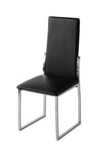 PRODUCT DESCRIPTIONS:Surround your dining table with the contemporary and stylish Metropolitan dining chair. The sophisticated black leather effect seat and chrome finish frame gives the chair a sleek, elegant look that would complement a room with modern décor. A slightly angled back and padded seat ensures a more comfortable seating position, while remaining durable and sturdy for everyday use. The Metropolitan chair will allow you to sit comfortably at the table leaving you to enjoy the company of friends and family for hours. 4 Pieces.