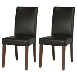 PRODUCT DESCRIPTIONS:A solid pine construction is lacquered with a walnut finish and upholstered with brown leather-effect fabric to create the sleek, modern look of these Banbury chairs. The striking contrast between the walnut-effect legs and the brown upholstery offers a contemporary twist for any dining room. This look allows it to complement both natural, neutral tones as well as bolder, darker colour schemes. 2 chairs supplied. Requires self-assembly.