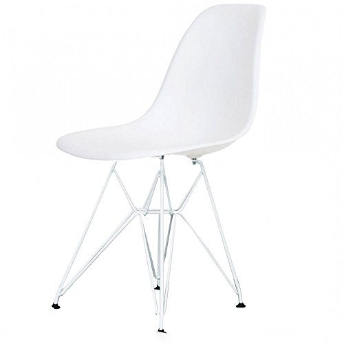 PRODUCT DESCRIPTIONS:This Eiffel Style Cool White Plastic Retro Side Chair with White Legs would look great in any contemporary space. This beautifully coloured replica Eames style DSR chair with its moulded seat and Eiffel style base, has a super stylish look. Combining comfort and strength, this piece would be ideal either as a statement chair or as a dining chair.