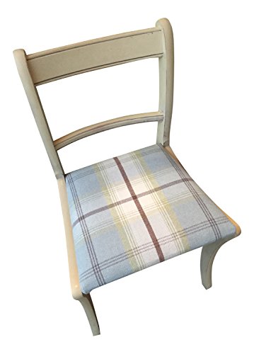 PRODUCT DESCRIPTIONS:UPCYCLED CHAIR IN ANNIE SLOAN PARIS GREY WITH A DUCK EGG TARTAN SEAT An upcycled regency style chair that would make a great occasional chair, bedroom chair, desk chair, or part of an eclectic dining set. Measurements: Width 50cm x Depth 50cm x Height 85cm. All our chairs are a standard seat height of approximately 47cm. These chairs are vintage and, as such, vary slightly in terms of detailing although always very similar. The are made to order to the exact colour and fabric that you have chosen and we will show you pictures of the different detailing in stock if we don't have the identical detail to the stock photo. Please look out for our message! Any questions, please ask us. PRODUCTS & SERVICES Bespoke orders Many customers order an eclectic mix of our chairs to create a unique dining set. You can alternatively order a set to your own specifications. Please look at our other items for inspiration. We are happy to source and paint special pieces of furniture for that extra special one off. Furniture painting service If you wish to have a piece of your own furniture repainted, we use Annie Sloan Chalk Paint. Please see the Annie Sloan website or Pinterest pins for a full range of colours. We have been involved in a number of commercial projects supplying furniture to pubs, restaurants, tea rooms & large student flats. Please contact us if you wish to discuss any of the above. GENERAL Please note that all items are made to order in our workshop by a small team of dedicated staff. Please bear this in mind and be reasonable about delivery times. Larger orders or chairs requiring more upholstering may at times take longer. If you have an urgent order then please contact us prior to purchasing and we will advise if we can speed up your order on 07533598867