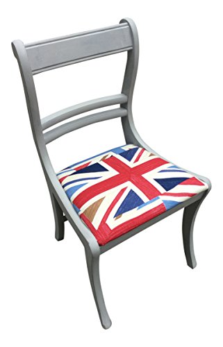 PRODUCT DESCRIPTIONS:UPCYCLED CHAIR IN ANNIE SLOAN PARIS GREY WITH A UNION JACK SEAT An upcycled regency style chair that would make a great occasional chair, bedroom chair, desk chair, or part of an eclectic dining set. Measurements: Width 50cm x Depth 50cm x Height 85cm. All our chairs are a standard seat height of approximately 47cm. These chairs are vintage and, as such, vary slightly in terms of detailing although always very similar. The are made to order to the exact colour and fabric that you have chosen and we will show you pictures of the different detailing in stock if we don't have the identical detail to the stock photo. Please look out for our message! Any questions, please ask us. PRODUCTS & SERVICES Bespoke orders Many customers order an eclectic mix of our chairs to create a unique dining set. You can alternatively order a set to your own specifications. Please look at our other items for inspiration. We are happy to source and paint special pieces of furniture for that extra special one off. Furniture painting service If you wish to have a piece of your own furniture repainted, we use Annie Sloan Chalk Paint. Please see the Annie Sloan website or Pinterest pins for a full range of colours. We have been involved in a number of commercial projects supplying furniture to pubs, restaurants, tea rooms & large student flats. Please contact us if you wish to discuss any of the above. GENERAL Please note that all items are made to order in our workshop by a small team of dedicated staff. Please bear this in mind and be reasonable about delivery times. Larger orders or chairs requiring more upholstering may at times take longer. If you have an urgent order then please contact us prior to purchasing and we will advise if we can speed up your order on 07533598867