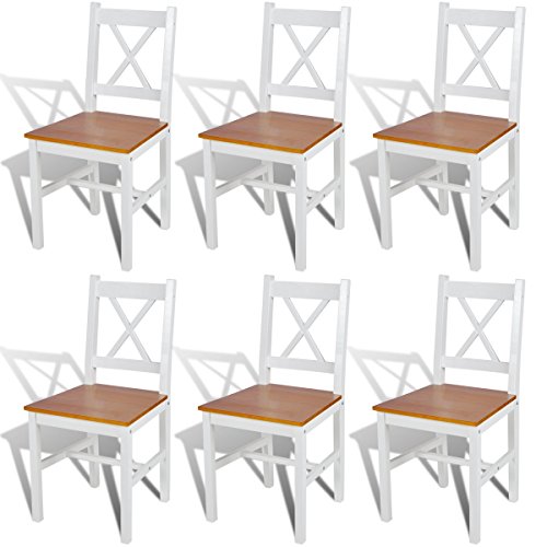 PRODUCT DESCRIPTIONS:This dining chair set, with a simple yet elegant design, consists of 6 pieces and will make a great addition to your dining room or kitchen.The chairs are made of solid pine wood, which makes them very stable and durable. The dining chairs are also easy to clean, thanks to their smooth paint finish. They've been ergonomically designed for added comfort.Delivery includes 6 dining chairs.