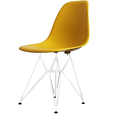 PRODUCT DESCRIPTIONS:This Eiffel Style Mustard Yellow Plastic Retro Side Chair with White Legs would look great in any contemporary space. Combining comfort and strength, this beautifully coloured replica Eames style DSR chair, would be ideal either as a statement chair or as a dining chair. The moulded seat and Eiffel style base, simply add to its super stylish look - you'll love this wow factor!