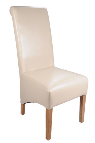 PRODUCT DESCRIPTIONS:Our most popular dining chair, a classic bonded leather roll-back design. Each chair has a sprung and belted seat area for additional comfort and to retain bounce and shape. Available in attractive and versatile colourways ivory, black, brown, burgundy. Solid oak legs. Supplied fully assembled. Chairs are sold in sets of two.