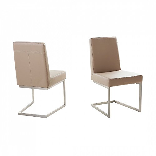 PRODUCT DESCRIPTIONS:The dining chair in café latte will be a focal point at your house. It is certainly a good investment, one that you will enjoy for a long time. Clean simple form emphasizes the refined design of this furniture and will introduce pleasant atmosphere to your interior. This dining chair offers the highest quality for the best price. Stable, silver steel legs are rust resistant and attract with their unique look. We care about the quality of our furniture that's why we give you the top quality guarantee! Details: Colour: cafe latte, silver, Material: Seat: faux leather, Leg: stainless steel, Dimensions: 52 x 49 x 96 cm, Seat height: 49,5 cm, Seat depth: 43 cm, Seating surface: 43 x 49 cm, Backrest height: 46,5 cm, Stackable: no, Indoor. Assets: Complementary chair elements, Sturdy steel frame, Timeless design, Easy to maintain. Maintenance tips: Clean light stains with a dry shampoo and damp sponge Use warm soapy water with difficult stains Do not use any caustic cleaning detergents Vacuum with a special tip Clean stains with distilled water.