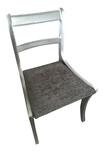 PRODUCT DESCRIPTIONS:UPCYCLED SILVER CHAIR WITH SILVER GREY CHENILLE SEAT An upcycled regency style chair that would make a great occasional chair, bedroom chair, desk chair, or part of an eclectic dining set. Measurements: Width 50cm x Depth 50cm x Height 85cm. All our chairs are a standard seat height of approximately 47cm. These chairs are vintage and, as such, vary slightly in terms of detailing although always very similar. The are made to order to the exact colour and fabric that you have chosen and we will show you pictures of the different detailing in stock if we don't have the identical detail to the stock photo. Please look out for our message! Any questions, please ask us. PRODUCTS & SERVICES Bespoke orders Many customers order an eclectic mix of our chairs to create a unique dining set. You can alternatively order a set to your own specifications. Please look at our other items for inspiration. We are happy to source and paint special pieces of furniture for that extra special one off. Furniture painting service If you wish to have a piece of your own furniture repainted, we use Annie Sloan Chalk Paint. Please see the Annie Sloan website or Pinterest pins for a full range of colours. We have been involved in a number of commercial projects supplying furniture to pubs, restaurants, tea rooms & large student flats. Please contact us if you wish to discuss any of the above. GENERAL Please note that all items are made to order in our workshop by a small team of dedicated staff. Please bear this in mind and be reasonable about delivery times. Larger orders or chairs requiring more upholstering may at times take longer. If you have an urgent order then please contact us prior to purchasing and we will advise if we can speed up your order on 07533598867