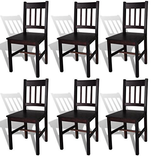 PRODUCT DESCRIPTIONS:Specifications Material: Wood Colour: Brown Material: Pine wood Chair size: 41.5 x 45.5 x 86 cm (W x D x H) Seat size: 41.5 x 39 cm (W x D) Seat height from the ground: 44.5 cm Back height: 42 cm Front foot size: 3 x 3 cm (L x W) Back foot size: 4.5 x 3 cm (L x W) Delivery includes 6 dining chairs