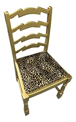 PRODUCT DESCRIPTIONS:UPCYCLED GOLD CHAIR WITH LEOPARD PRINT SEAT An upcycled Ladder Back style chair that would make a great occasional chair, bedroom chair, desk chair, or part of an eclectic dining set. Measurements: Width 50cm x Depth 50cm x Height 85cm. All our chairs are a standard seat height of approximately 47cm. These chairs are vintage and, as such, vary slightly in terms of detailing although always very similar. The are made to order to the exact colour and fabric that you have chosen and we will show you pictures of the different detailing in stock if we don't have the identical detail to the stock photo. Please look out for our message! Any questions, please ask us. PRODUCTS & SERVICES Bespoke orders Many customers order an eclectic mix of our chairs to create a unique dining set. You can alternatively order a set to your own specifications. Please look at our other items for inspiration. We are happy to source and paint special pieces of furniture for that extra special one off. Furniture painting service If you wish to have a piece of your own furniture repainted, we use Annie Sloan Chalk Paint. Please see the Annie Sloan website or Pinterest pins for a full range of colours. We have been involved in a number of commercial projects supplying furniture to pubs, restaurants, tea rooms & large student flats. Please contact us if you wish to discuss any of the above. GENERAL Please note that all items are made to order in our workshop by a small team of dedicated staff. Please bear this in mind and be reasonable about delivery times. Larger orders or chairs requiring more upholstering may at times take longer. If you have an urgent order then please contact us prior to purchasing and we will advise if we can speed up your order on 07533598867