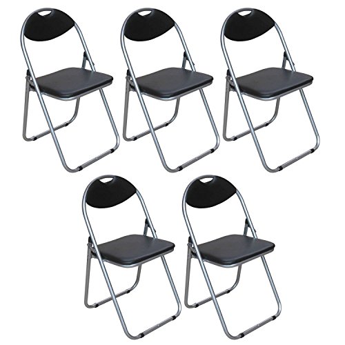 PRODUCT DESCRIPTIONS:Whether it's for a dining table, your work or as an extra seat, the versatility of the folding chair is ideal for all occasions. The metal frame is given a silver powder coated finish, while the padded black PVC seat and back rest ensure the chair is lightweight, durable and stylish. A handle on the back rest allows for easy movement, so when not in use you simply fold for compact storage. The combination of black and silver will complement most decors for a modern look. 5 Piece.