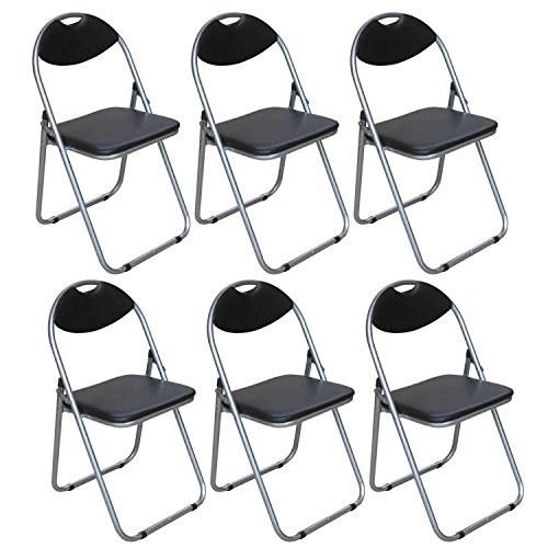 PRODUCT DESCRIPTIONS:Whether it's for a dining table, your work or as an extra seat, the versatility of the folding chair is ideal for all occasions. The metal frame is given a silver powder coated finish, while the padded black PVC seat and back rest ensure the chair is lightweight, durable and stylish. A handle on the back rest allows for easy movement, so when not in use you simply fold for compact storage. The combination of black and silver will complement most decors for a modern look. 6 Piece.