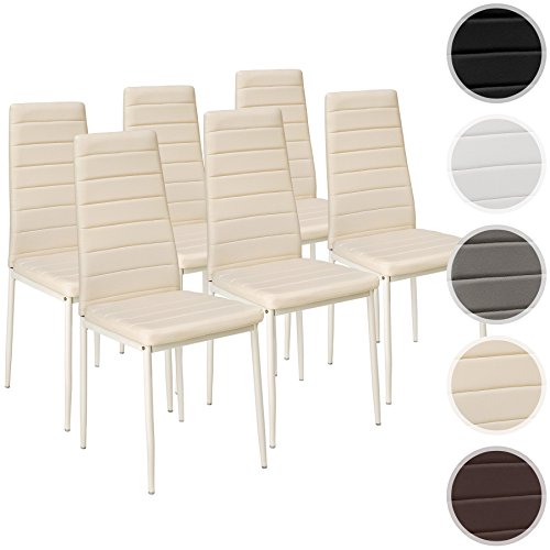 PRODUCT DESCRIPTIONS:These beautiful, elegant chairs in the set will visually beautify your dining room, your kitchen, the waiting room or practice or your Bistro by their modern simplicity. But not only that! Our chairs are light, soft and very comfortable and feature a high degree of seated comfort. The durable synthetic leather cover feels comfortable and is easy to clean. Since the chairs are nice and light, they can be lifted easily. To protect your floor and to avoid noise, the chair legs are equipped with plastic caps. The upholstery is approximately 3 cm.